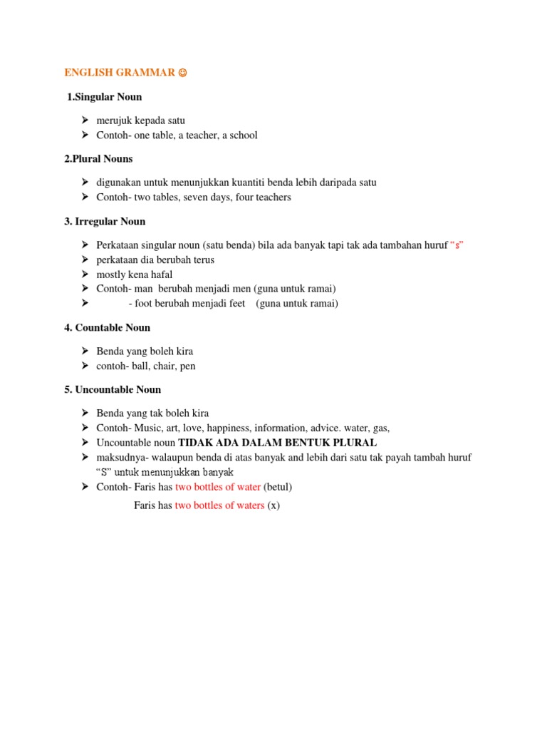 Perlu diingat ya bahwa singular merupakan bentuk tunggal sedangkan plural merupakan bentuk jamak. Countable Noun adalah noun kata benda yang dapat dihitung. Subject dapat berbentuk phrase dengan kata of ditengahnya.